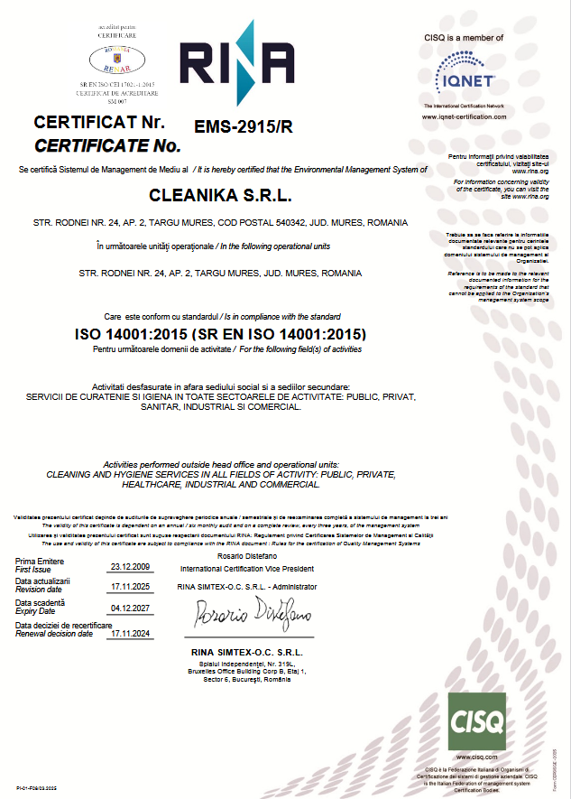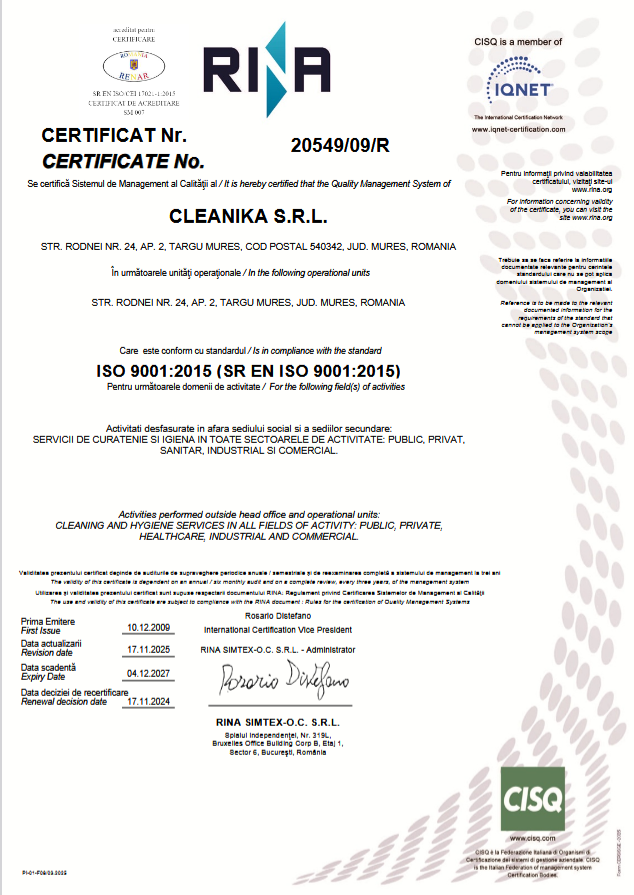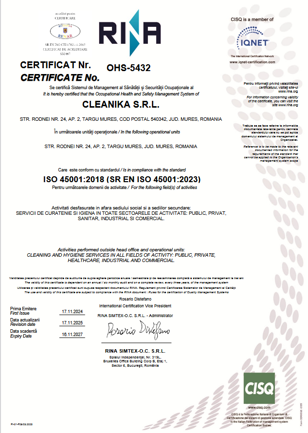 Cele mai importante certificări care garantează calitatea în curățenia profesională sunt ISO 9001 (Calitate), ISO 14001 (Mediu) și ISO 45001 (Sănătate și Securitate). Aceste standarde internaționale confirmă existența unor procese operaționale bine structurate, monitorizate și sigure pentru angajați și beneficiari.